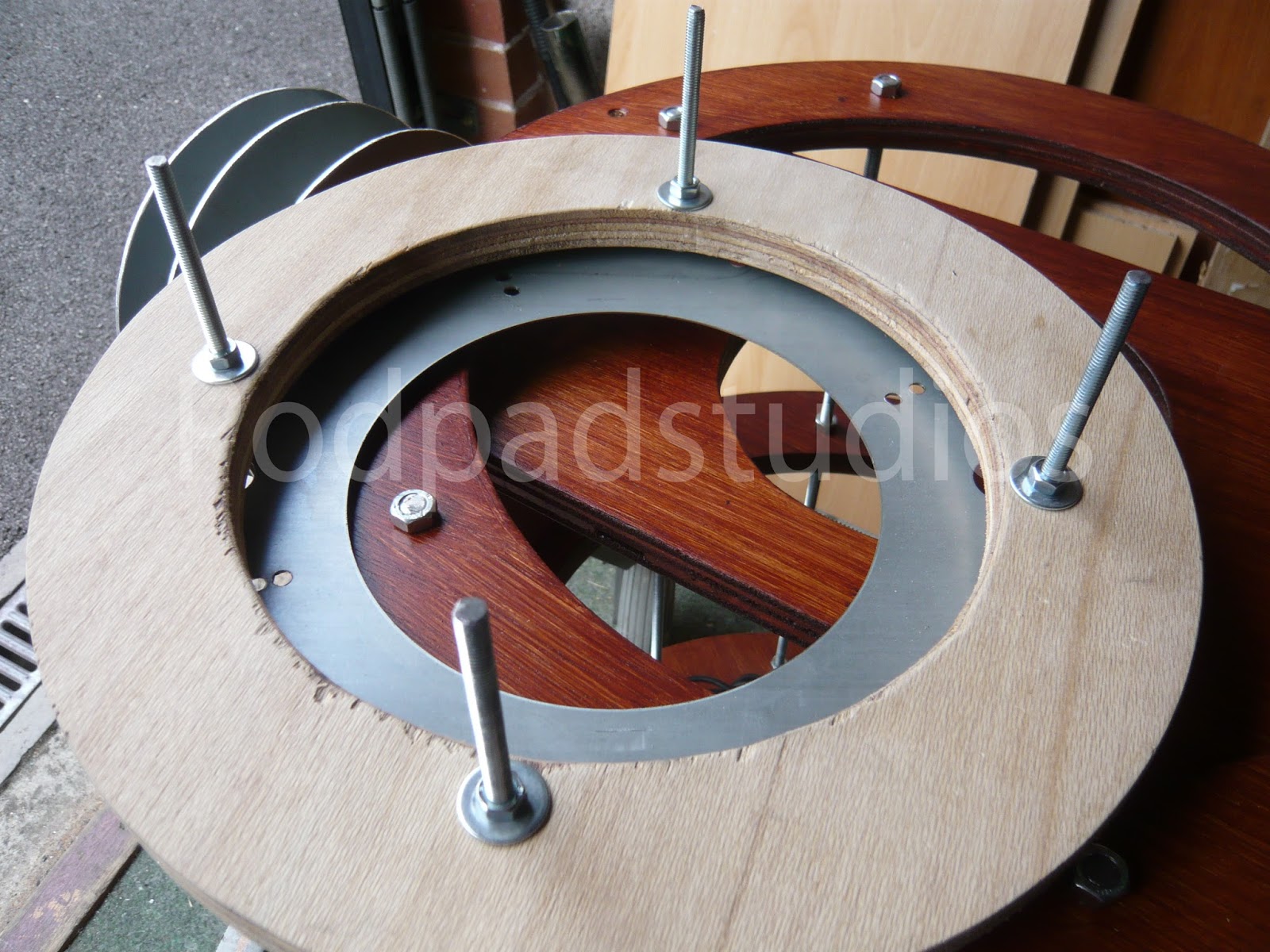 The dome is my usual B&Q metal lamp shade. This time I have removed all the red paint, which took some doing, to give me a cleaner back to metal look. The underside of the dome is fitted out with a wooden base which will locate on the bolts protruding from the shoulder bearing. I have gone with a slightly larger wood base on this dome, it should help when mounting electronics in the dome.
